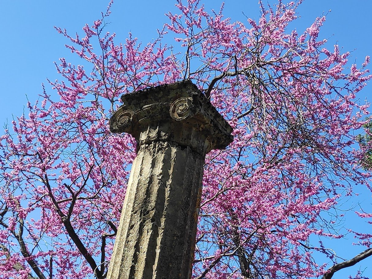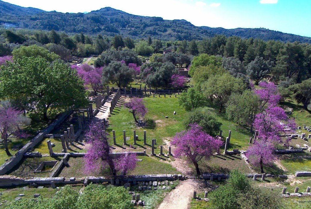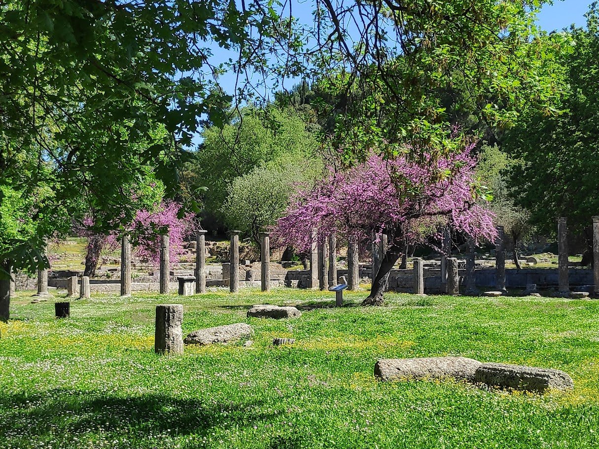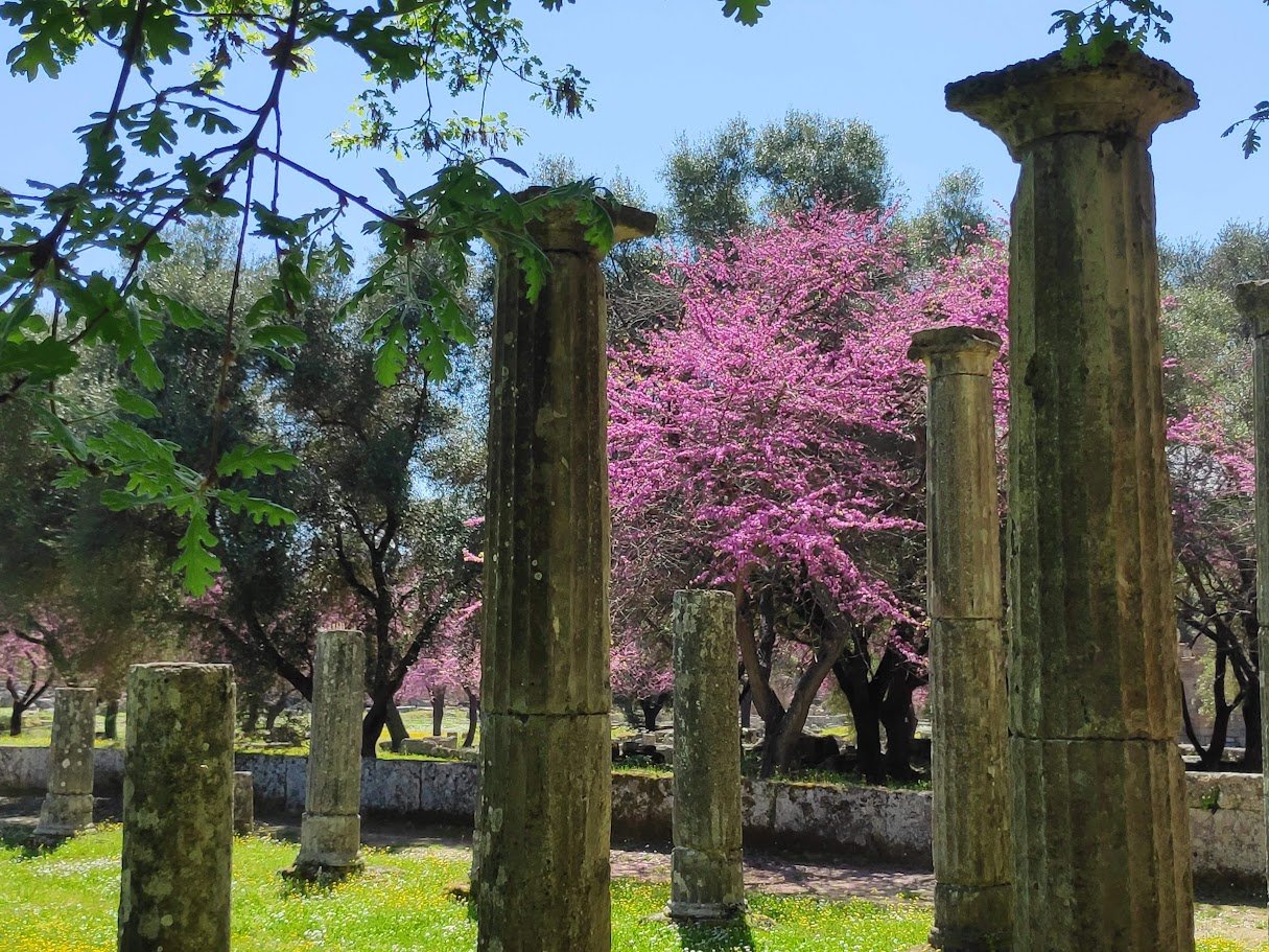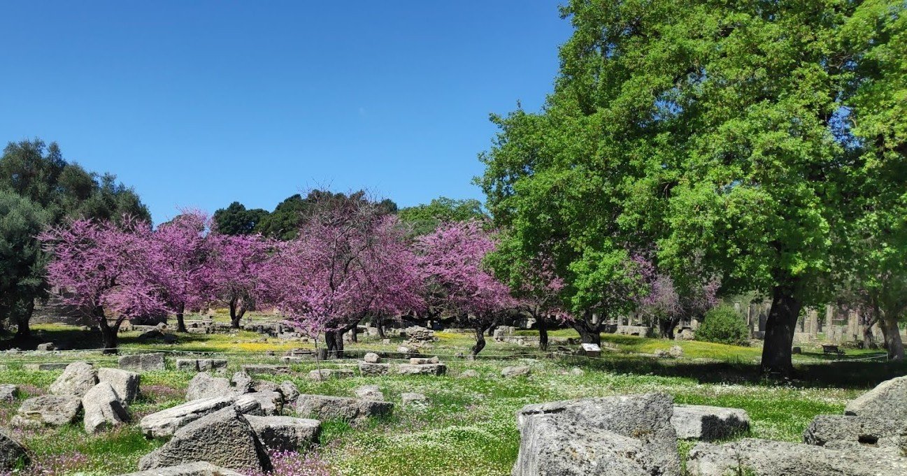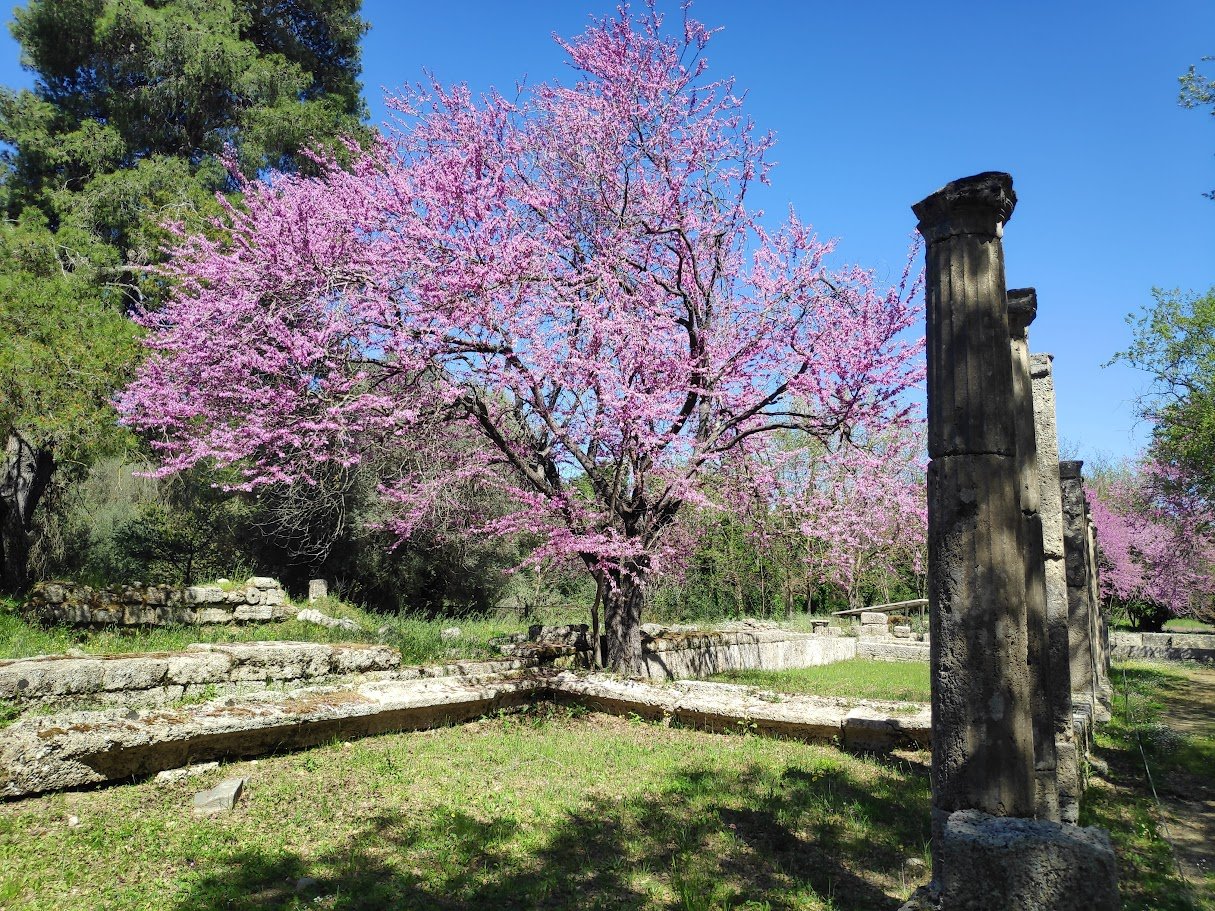 Κάθε άνοιξη, η Ιερή Άλτις προσφέρει ένα θέαμα που κόβει την ανάσα. Ανάμεσα στους κίονες από ιερό κογχυλιάτη και στα αιωνόβια δέντρα, οι κουτσουπιές ξεχωρίζουν, στολίζοντας τον αρχαιολογικό χώρο με τις θεσπέσιες ροζ-μωβ ανταύγειές τους.