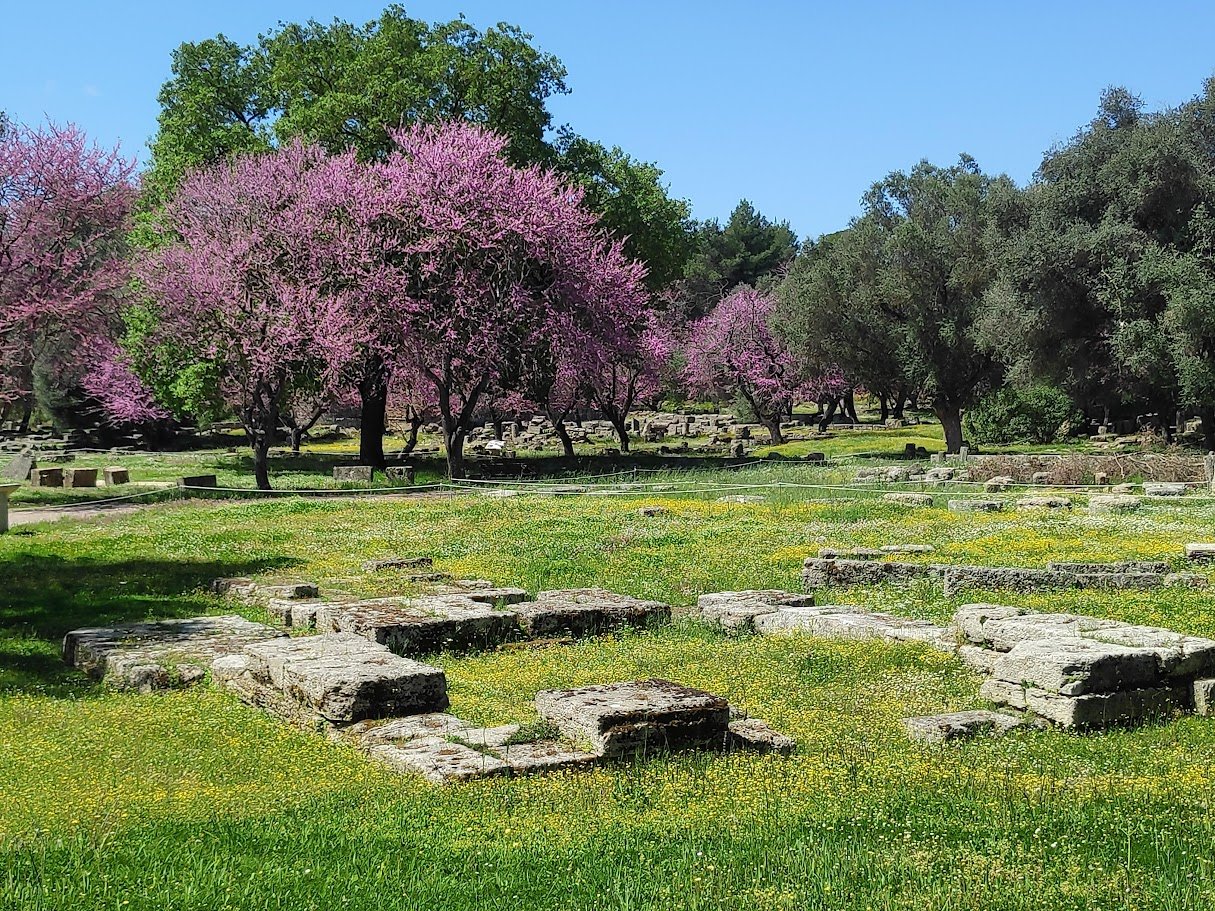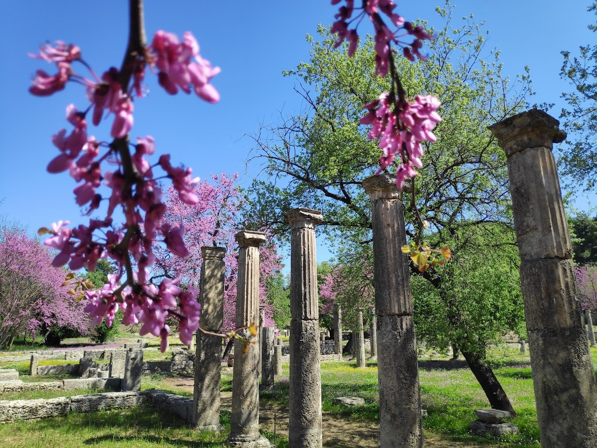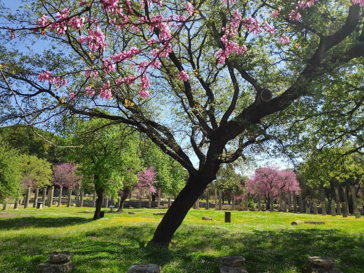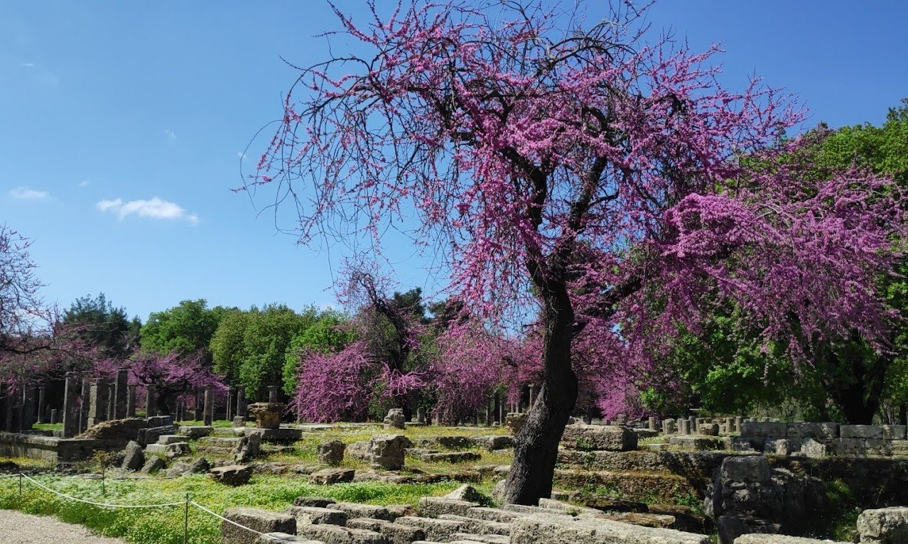 Σήμερα οι κουτσουπιές, αδιάφορες για τα ανθρώπινα δράματα, χαρίζουν αφειδώς την ομορφιά τους και μόνο εμμέσως θυμίζουν στους επισκέπτες της Ολυμπίας ότι διανύουμε την εβδομάδα των Θείων Παθών, μέσα από τους στίχους του γνωστού, κατανυκτικού ύμνου της Ορθόδοξης Εκκλησίας “Ω γλυκύ μου έαρ” που ψάλλεται κατά την Ακολουθία του Επιταφίου τη Μεγάλη Παρασκευή…